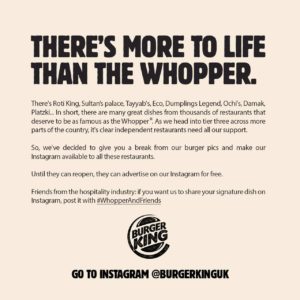 Several large brands have capitalised on this recently, by using their ATL campaigns not to push their own products, but to divert people’s attention to local, small independents during the COVID-19 pandemic and national lockdown. In reality, this won’t impact their profits, but it will create national headlines and cement them as a brand that cares about the wider community.